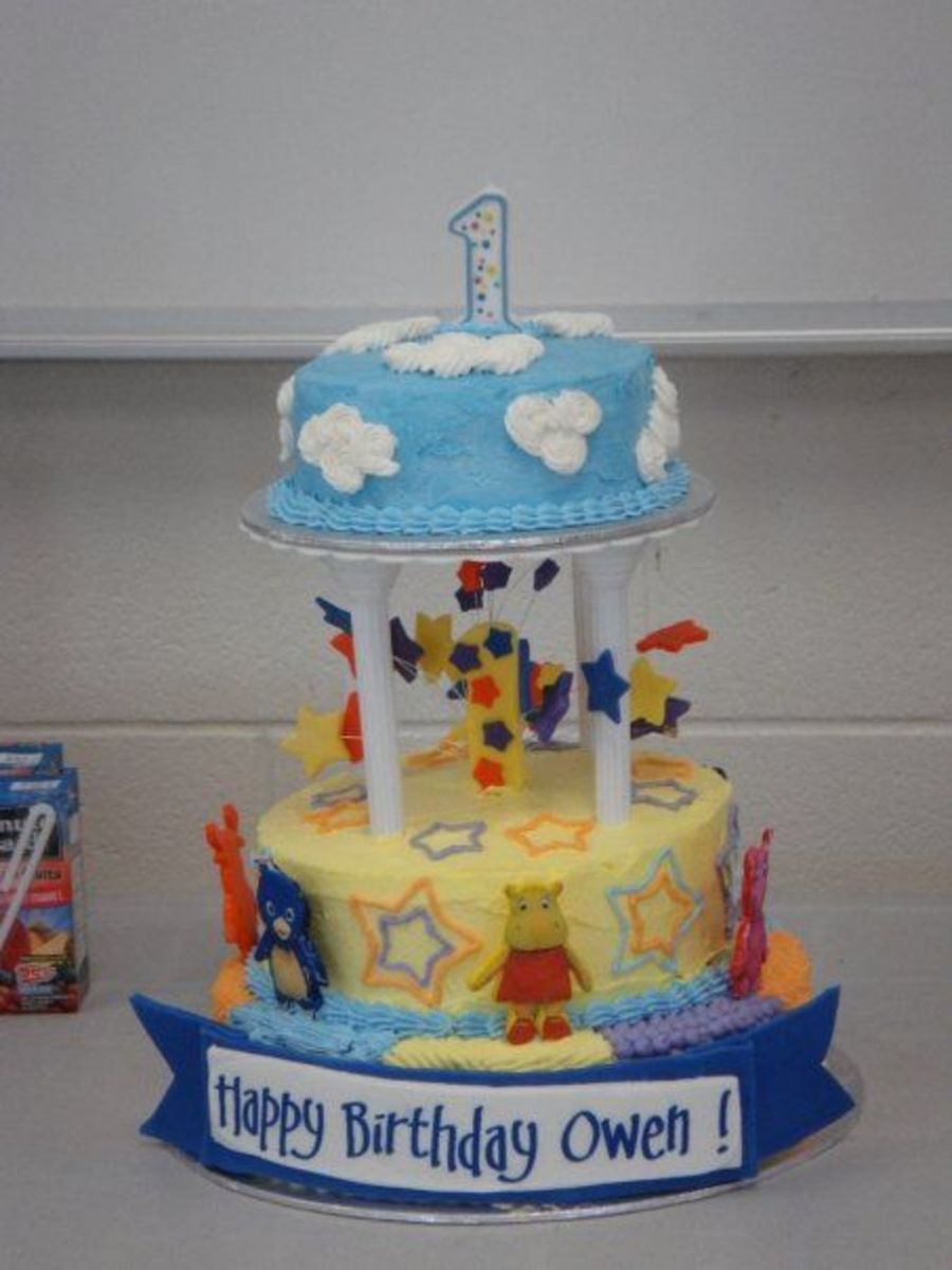 This cake was for my cousins sons first birthday. IMBC and chocolate cake. The figures were icing photo plaques and the #1 star topper and banner were made with gumpaste.