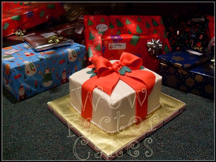 Inspired by Merissa's Christmas package cake. My bow is a little bit different. Chocolate cake with buttercream frosting. Fondant bow, holly leaves and berries.