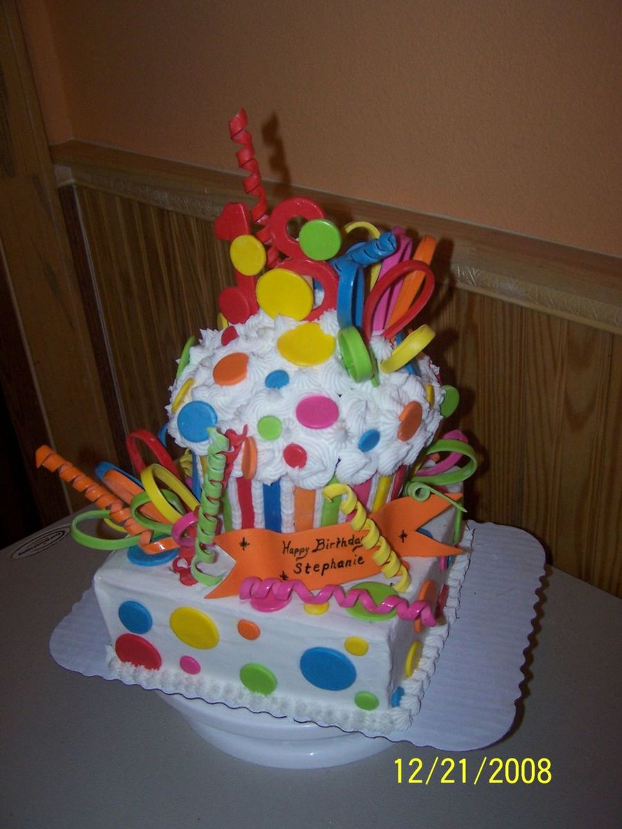 This is a 8x8 square and giant cupcake vanilla confetti cake with BC icing and fondant decor. for my friends 18th BD