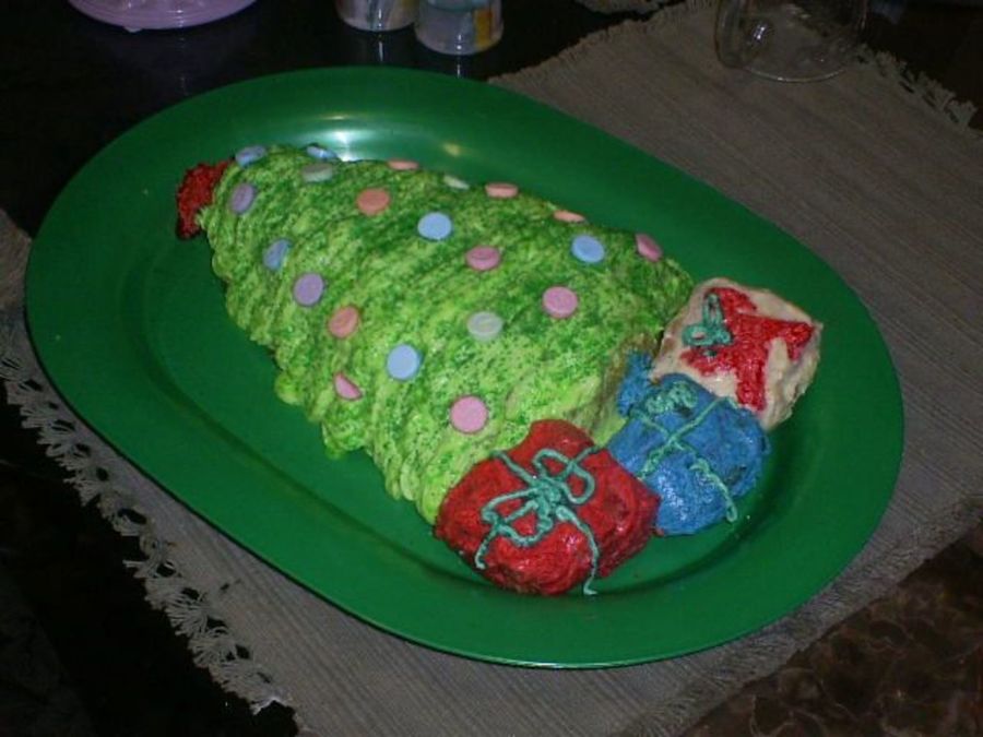 This is my Christmas tree cake that I made for my family. I put sweet tarts instead of M&Ms b/c my son is allergic to peanuts. My daughter said the sweet tarts look like Christmas lights. So, that's what they are.