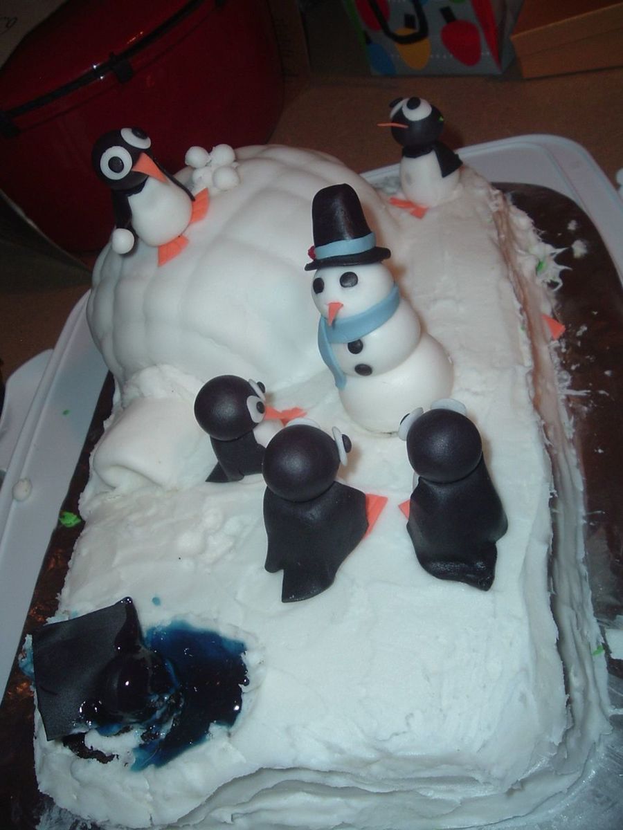 This is my larger version of the igloo cake. The characters are all fondant, as well as the igloo covering. The rest is RI. My nephew lovingly drowned one of the penguins in the "pond".