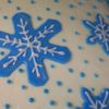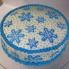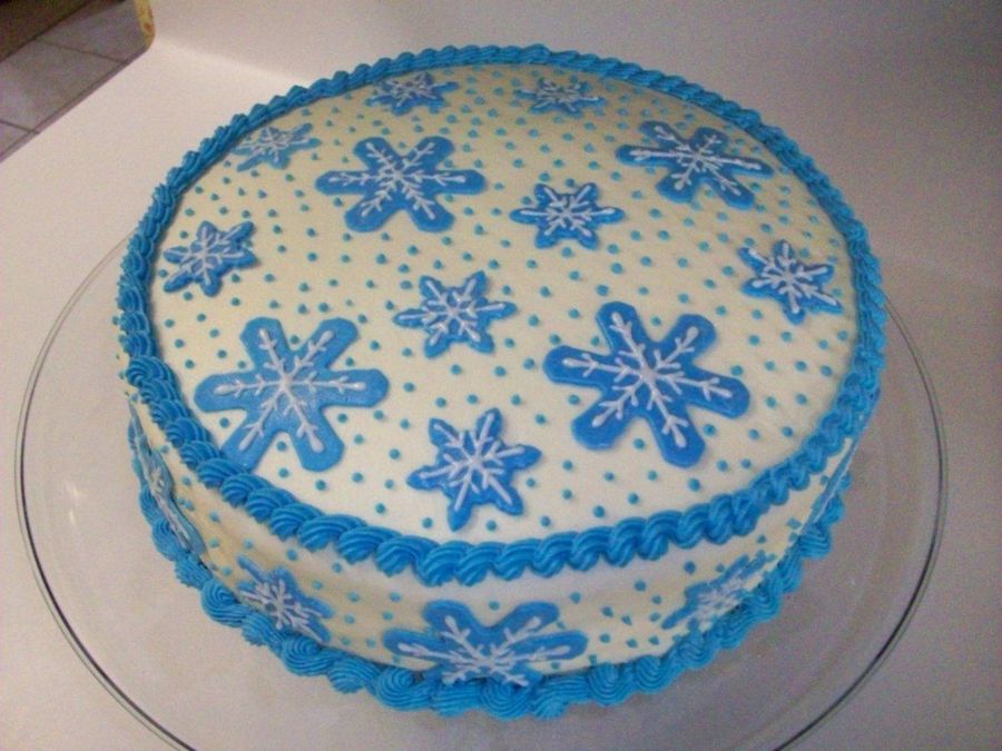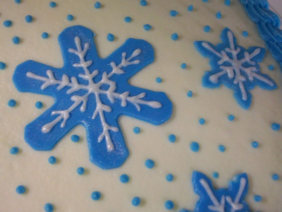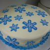 A carrot cake with cream cheese frosting and fondant snowflakes. I made this for my daughter's winter-themed bridal shower.