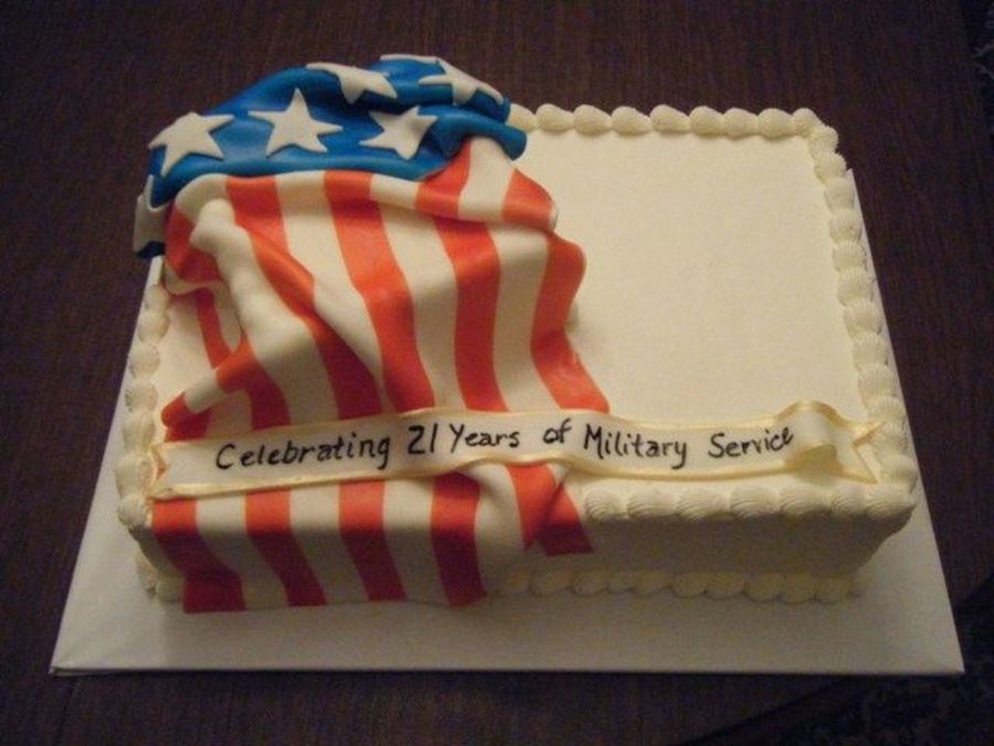 MMF flag draped over 10x15x3 cake (has a 6" square on top to give the flag something to drape off of). Cake extender yellow cake with buttercream and raspberry filling. I should have draped the flag more to the right, to cover that great expanse of blank white space, but once the flag is on there, there's no moving it. I was going to add some stars or airbrushing, but I really didn't want to detract the eye from the flag. Thanks for looking!