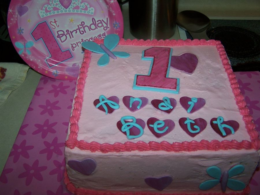 AndiBeth's forst birthday. Big cake to match plates and napkins and matching 6in smash cake. BC icing, fondant accents.