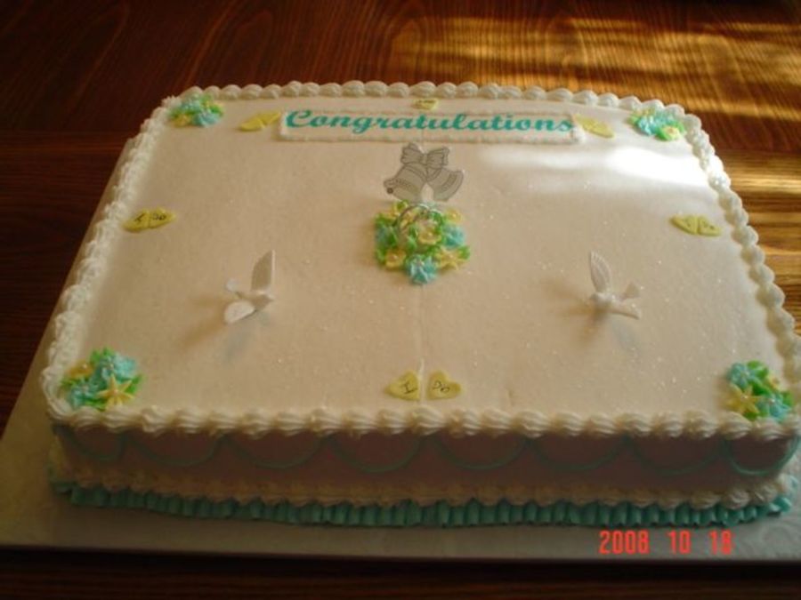 Made this 9x13 for a friend of my Mother's for a very simple wedding. Cake was white iced with BC. Trimmed with blue and yellow fondant flowers, bell pick, dove picks, and I Do fondant hearts. The bride and groom were surprised!!