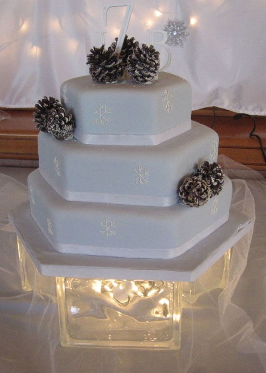 Snowflakes and pinecones based on a Martha Stewart design. White choc raspberry and chocolate hazelnut cakes. Thanks to the person who first used lighted glass blocks...I love the effect of the stand.