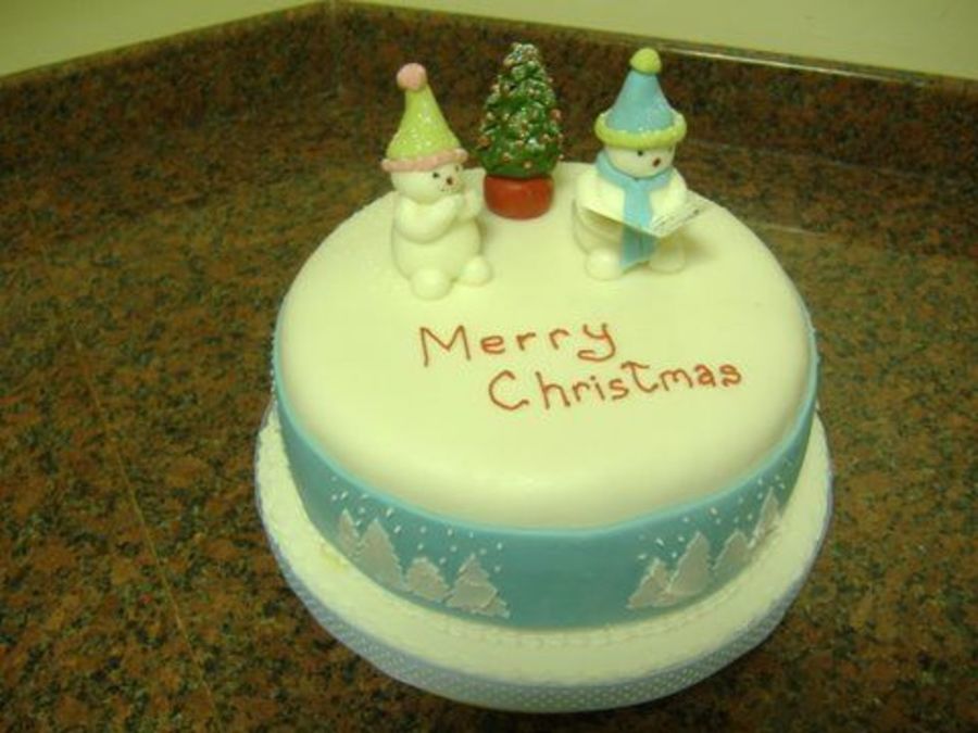 Chocolate Biscuit Cake covered in Almond Paste & Sugarpaste with Sugarpaste Decorations. Royal Iced Tree Stencils on the side.