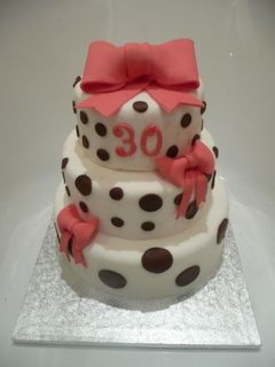dummy fondant cake with pink bow and brown polka dots