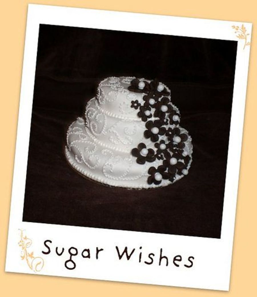 6" 4" & 3" Mini vanilla cake with buttercream, covered in fondant., buttercream scroll design. Chocolate fondant flowers, pearl centers. This was just for practice and I had so much fun.