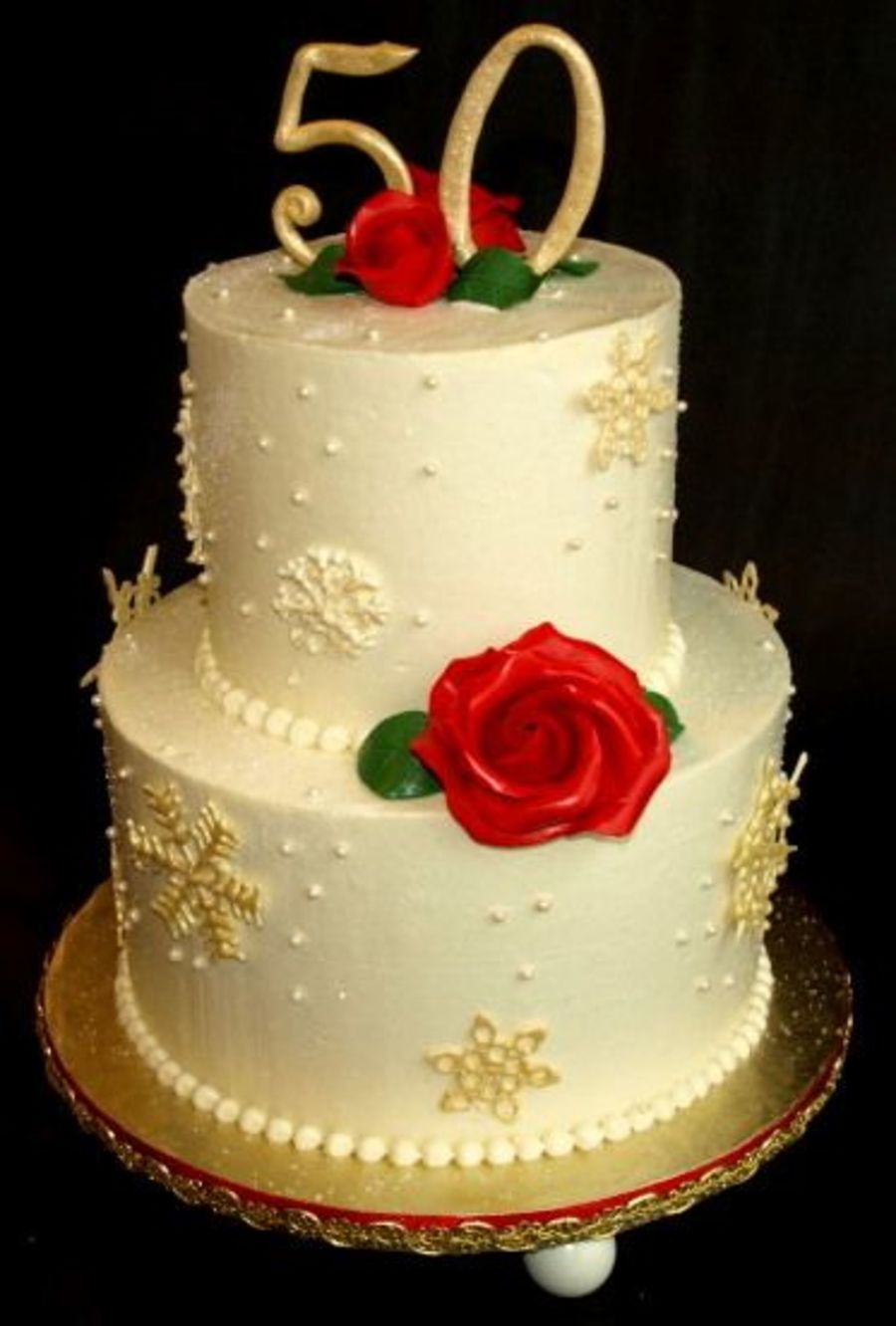 For a fiftieth golden anniversary, this is a white chocolate buttercream frosted cake with white chocolate snowflakes painted with gold pearl dust. The topper is gum paste, the roses are fondant. I steamed the roses and leaves to get a nice shine and was really pleased with the result. I also added some ivory pearl dragees and threw on some sanding sugar to get a twinkling snow effect which you can't see really well in the picture. The cake inside was chocolate with peppermint candy cane buttercream.