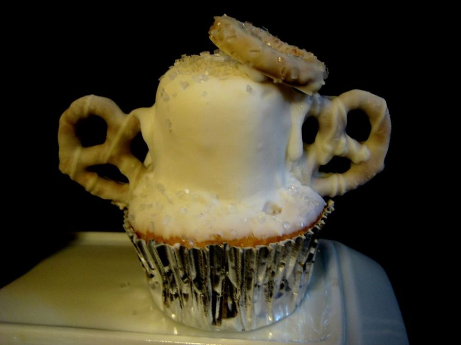 Vanilla cupcake with marshmallow frosted on and dipped in white icing. Chocolate covered pretzel wings and halo
