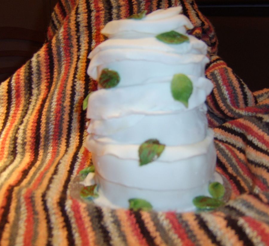 fruit cake marzipan coated and wrapped in sugarpaste bandage with marzipan falling autumn leaves