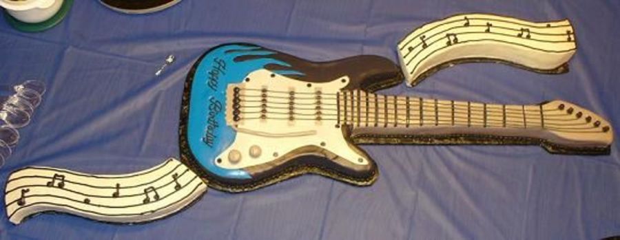 Guitar is done with buttercream & fondant. The music lines & notes are cake covered in buttercream. My son loved it.