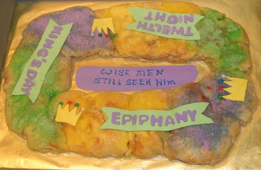 This is a New Orleans King Cake to celebrate the Three Wise Men and the Epiphany. The cake is decorated with a sugar glaze and colored sugar. I made fondant accents for the banners and crowns.