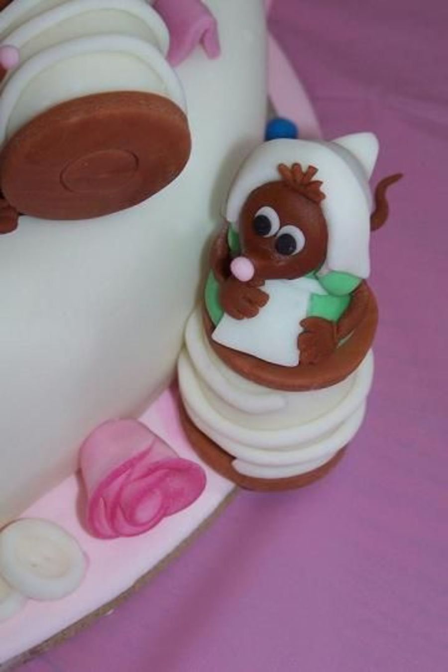 Ok, so I am hooked! Aine2 makes figurines look so easy, that I just had to apply her methods to this mouse. She gave me great advice on this one, and was really supportive. Fondant spiked with some Tylose Powder to make it dry harder. Made for a 4 year old's Cinderella birthday cake. The cake itself was inspired by freubelmuisje, who did a beautiful job. I hope to half that good one day. TFL!