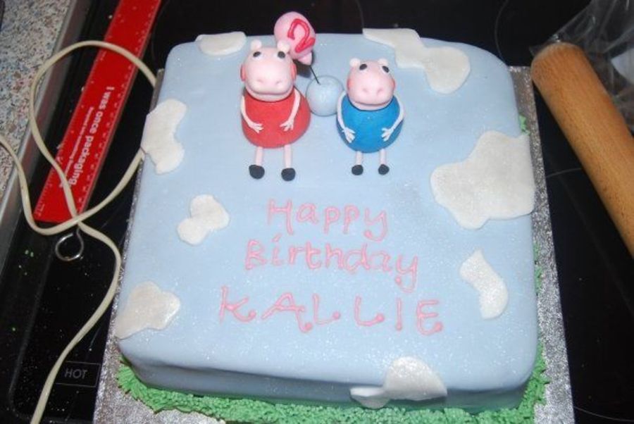 My 3rd cake for my Nieces 2nd Birthday. First time using 50/50 combo for the figures and boy did it make a great difference! Just need to figure out the balloons!! The characters are called Peppa & George from a UK TV Show called Peppa Pig, I forgot to add the smiley mouth which I remembered last minute and added which made them look tons better, I just didnt get a pic!
