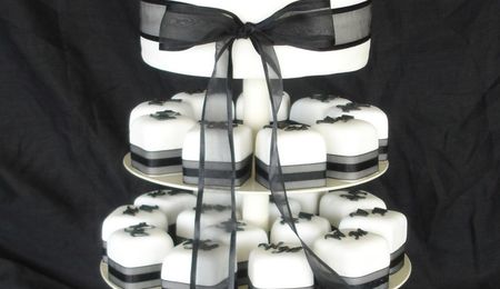 Black and white cake with dividers between each cake. Chocolate mudcakes