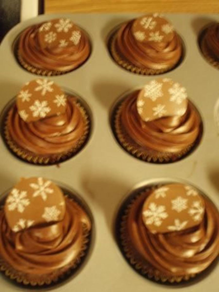chocolate cupcakes, with chocolate frosting, and chocolate circles with snowflake chocolate transfer