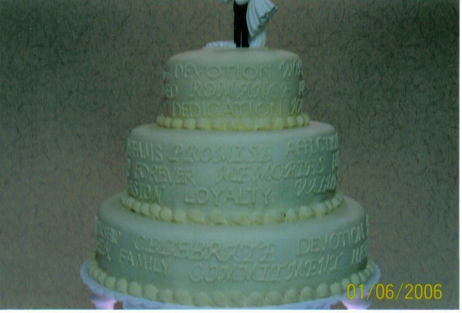 Ivory Fondant three tier with b/c shell border.... I wrote all romantic words all around the cake from top to bottom for a girlfriend of mine. She saw pictures of my cousins wedding cake from 10 yrs back and absolutely loved it and wanted it.