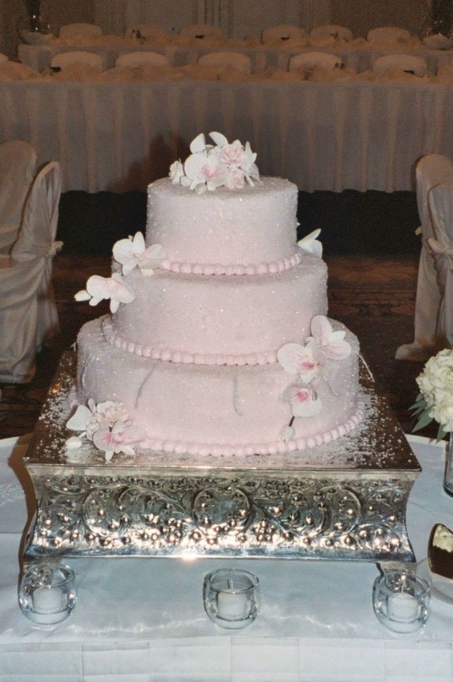 Cakes are 16", 12", and 8". I iced them with light pink buttercream. I then added a thin layer of piping gel and quickly applied clear sparkling sugar. I made the orchids and roses from gum paste.