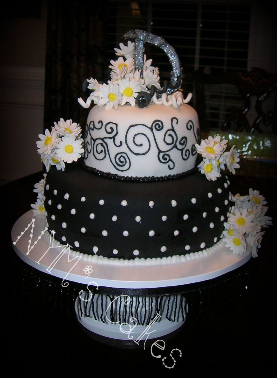 WASC cake with extra creamy buttercream. Black and white theme for 50th birthday. Daisies are gumpaste, D is gumpaste....rest covered in fondant.
