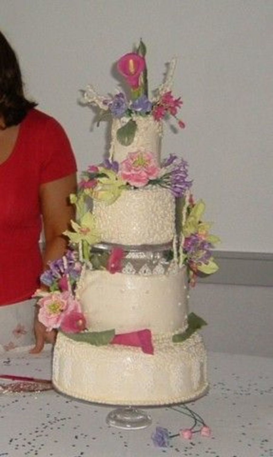 Thank you so much. This was my gift to my sister-in-law last summer. It was my third wedding cake. The branches were made of white chocolate and had edible pearl "berries."