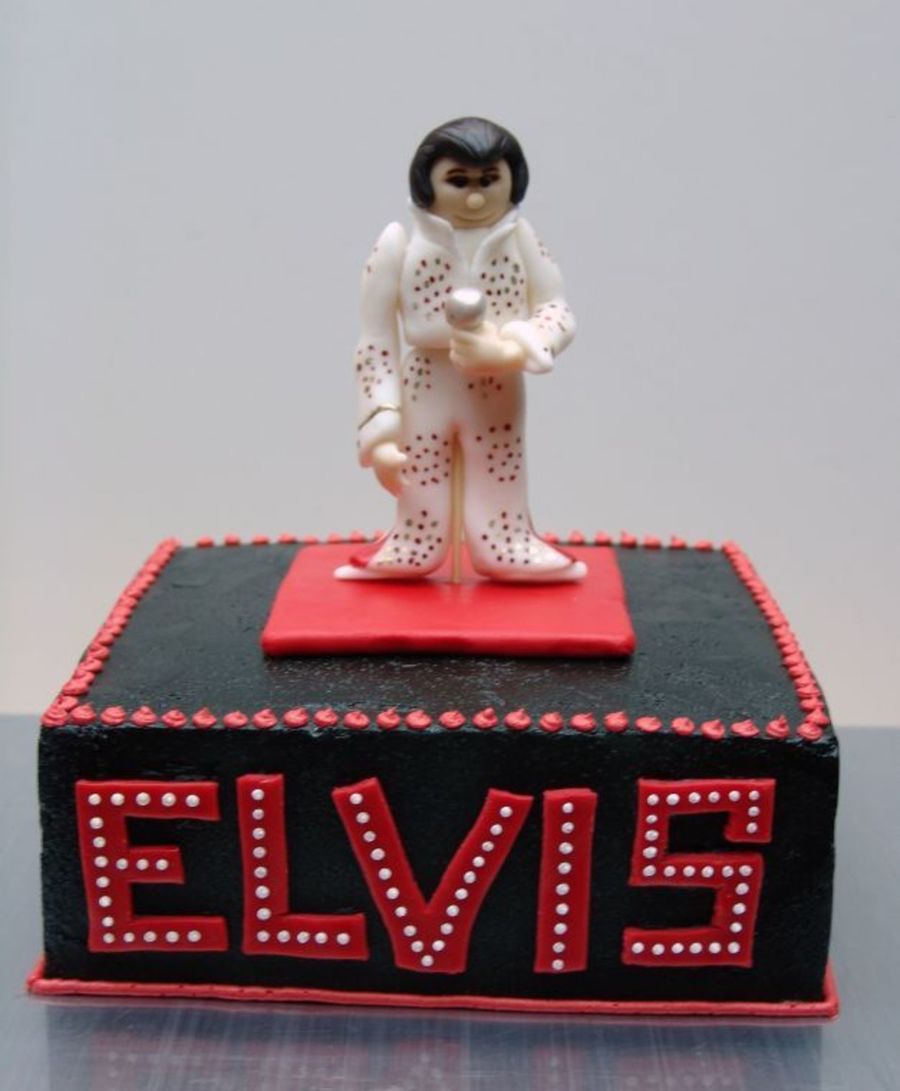 This is an 8" square cake with a 50/50 Elvis figure. "Elvis" is fondant with white bc dots. The black on the cake was airbrushed.