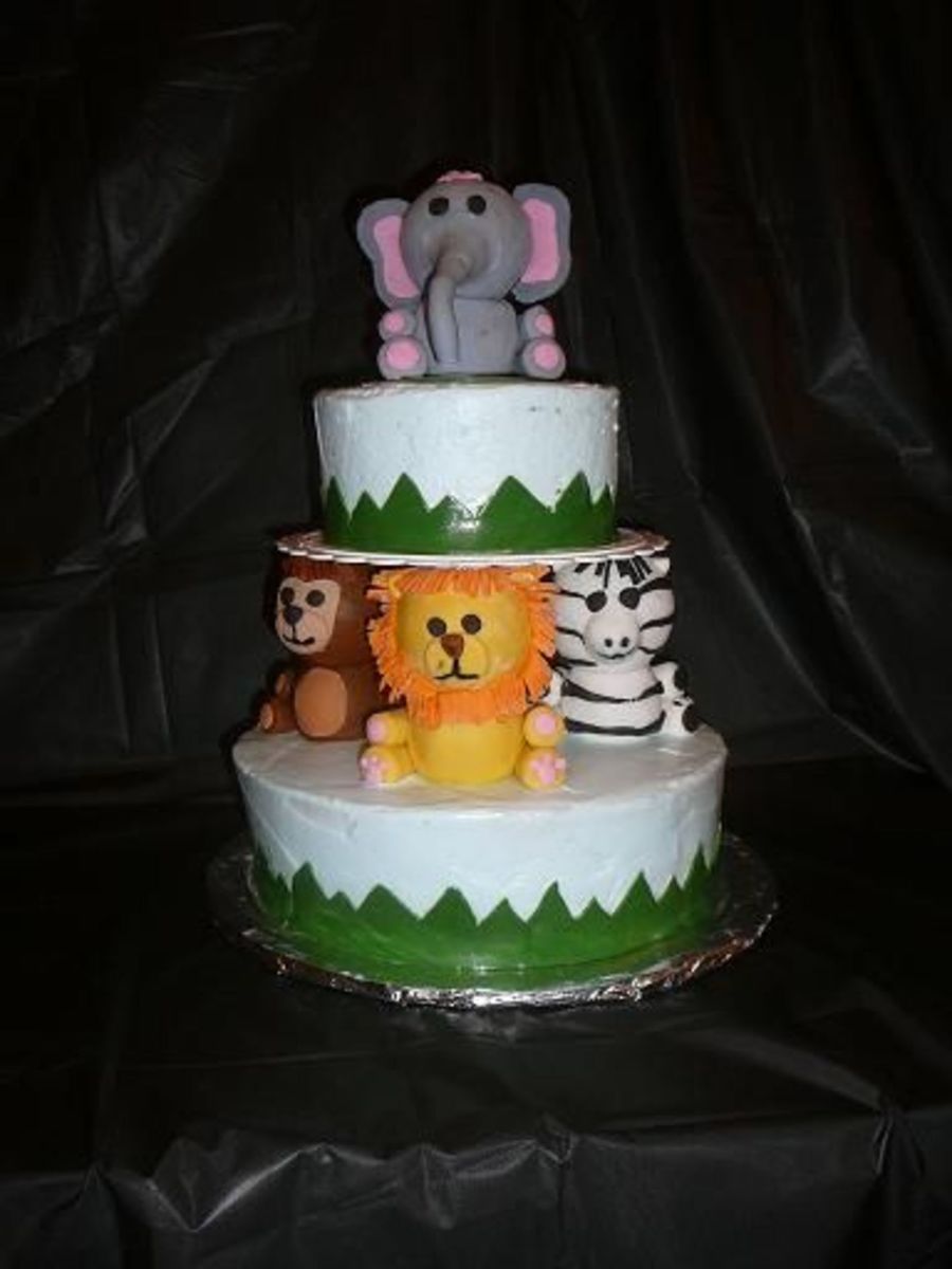 This was based on the Amazing Amazon Cake in one of the Wilton Yearbooks (sorry I can't remember which year). Its a 10" and 8" round vanilla cake. The animals were made out of fondant wrapped around the ball bases from the Wilton Globe Pillar and Base Set.