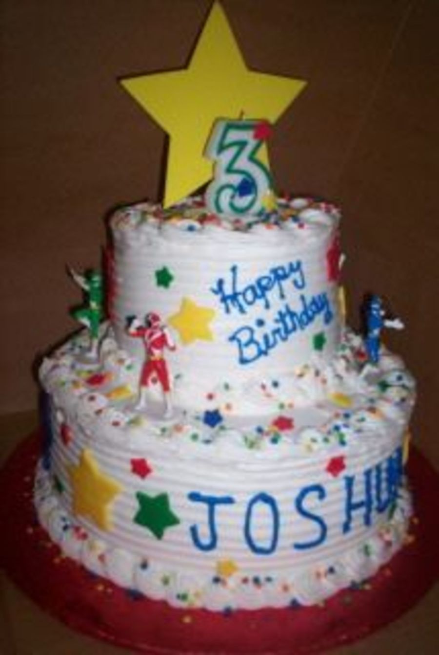 6 and 10 inch stacked cake for my 3 year old Power Ranger. Buttercream with fondant accents.