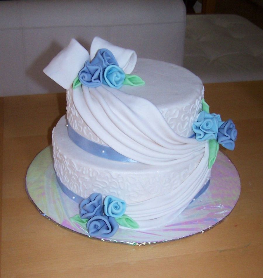 This is the first wedding cake I made. Unfortunatley, it's not for an order, but rather I wanted to make one for practice since I had never done one before. Im pretty happy with the outcome. It was also the first time I have done swags/drapes and swag flowers. All fondant except cornelli lace which is hand piped buttercream. TFL!