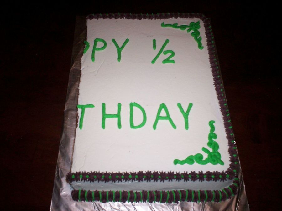This cake was a joke we played on a co-worker. We found out it was his 1/2 birthday. So I made a cake ( it actually was a whole cake) but I made it look like we had eaten half of it....so it appeared that he got a half of a cake. It was BC icing, and the edge was cut off to make it look like the rest of it was missing.