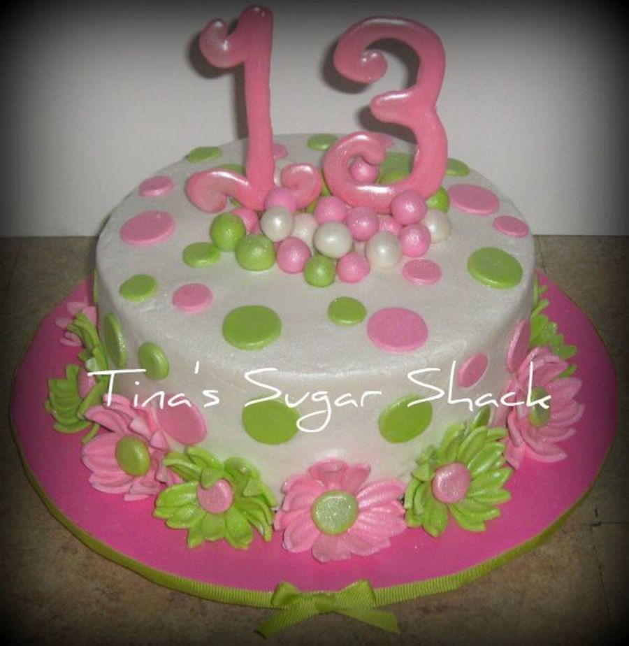 8"x4" round cake iced in buttercream w/ pink/green mmf polka dots, balls, and gerberra daisies, and white chocolate number "13" on top. The inside of the cake was white with pink/green confetti as well. TFL