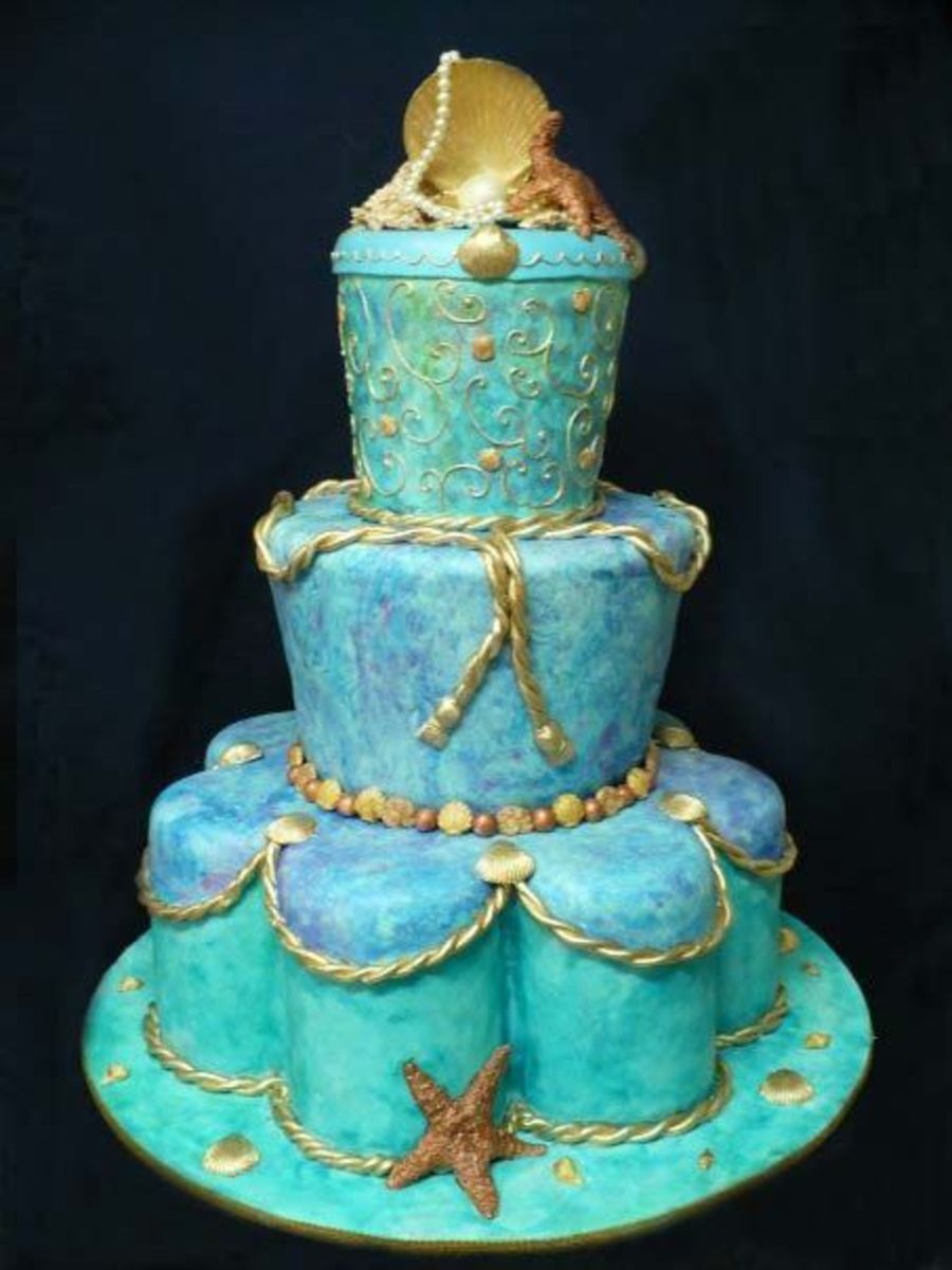 Worked with fondant and sea shells and star of gumpaste The cake mixing paint by hand and use various colors much the pearl and gold dust