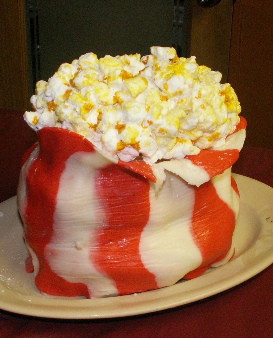 This cake is layers of chocolate cookie, mint/chip ice cream, whipped cream, more chocolate cookie, vanilla/chocolate ice cream, more whipped cream, then marshmallow "popcorn" all wrapped in a fondant "bag"