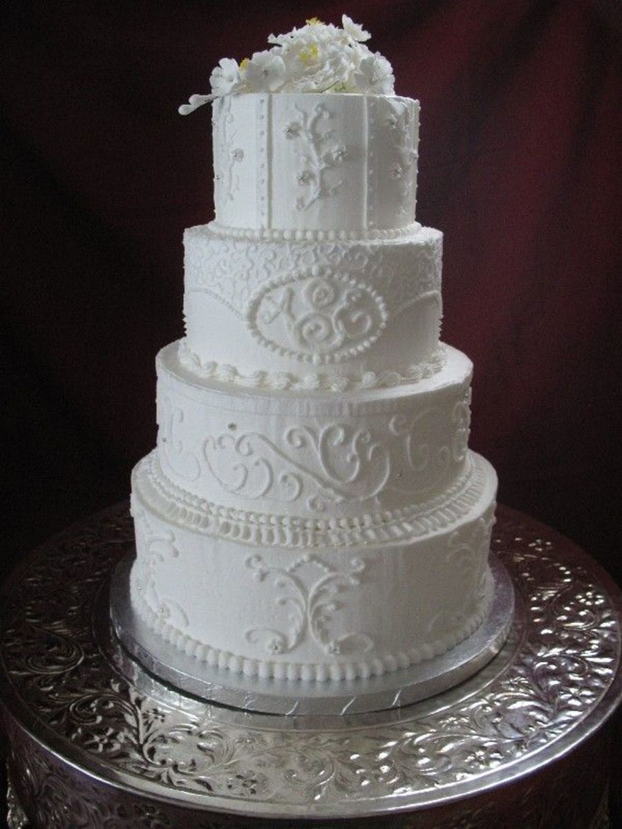 A dummy I did for an event coming up, to go with some modern fondant designs. My own design, based on some dress patterns and other cakes I've liked. All crisco BC, which I HATE working with (always use IMBC), so I'm not that happy with any of the quality of the piping, but I wanted to see if I could do it. GP flowers. The whole thing from mixing icing to taking the photo took 3 hours, 5 minutes, so I'm getting faster.