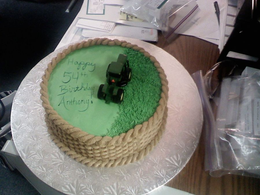 This was made for a friend at work. It was her dads' 54th birthday and he loves tractors. 4" tall 8" round vanilla cake with vanilla buttercream.