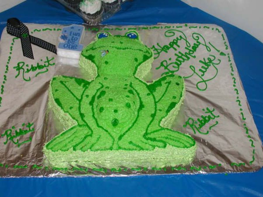 I made this frog cake for a friends son's 1st birthday. I found a unique frog pin on line which inspired the shape and used 2 cake pans to cut him out. They loved it!