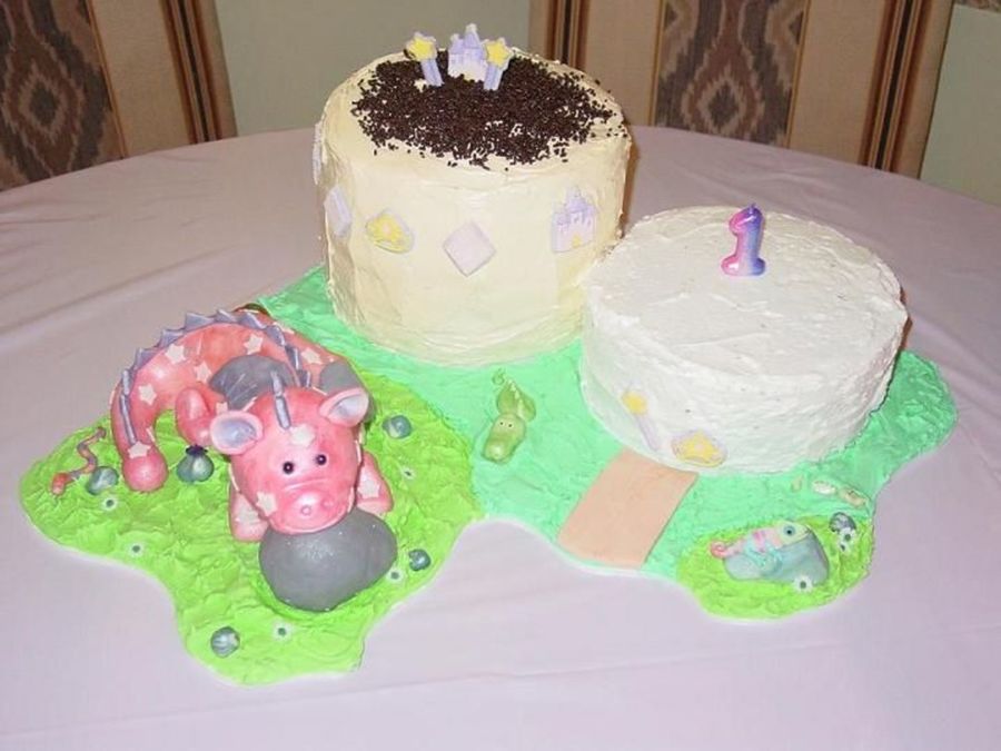 This cake was made for my daughters 1st birthday. The dragon is made out of RKT and the rest were fondant. I was going to make the cakes castles but Wilton fondant sucks and I had no time to fix it so this is it. TFL!