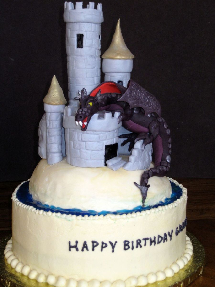 Made for Grandson's birthday, held the same day as granddaughter's and is a complement to the sleeping beauty cake. The castle turrets have a krispy treat base, except for the small one, which is a dowel. Everything is made of white chocolate fondant, except the wings, which are gumpaste