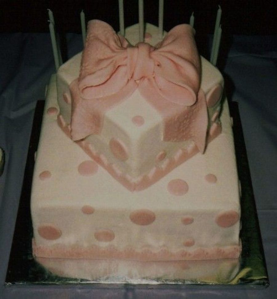 2-tiered square cake with a fondant bow and trim.