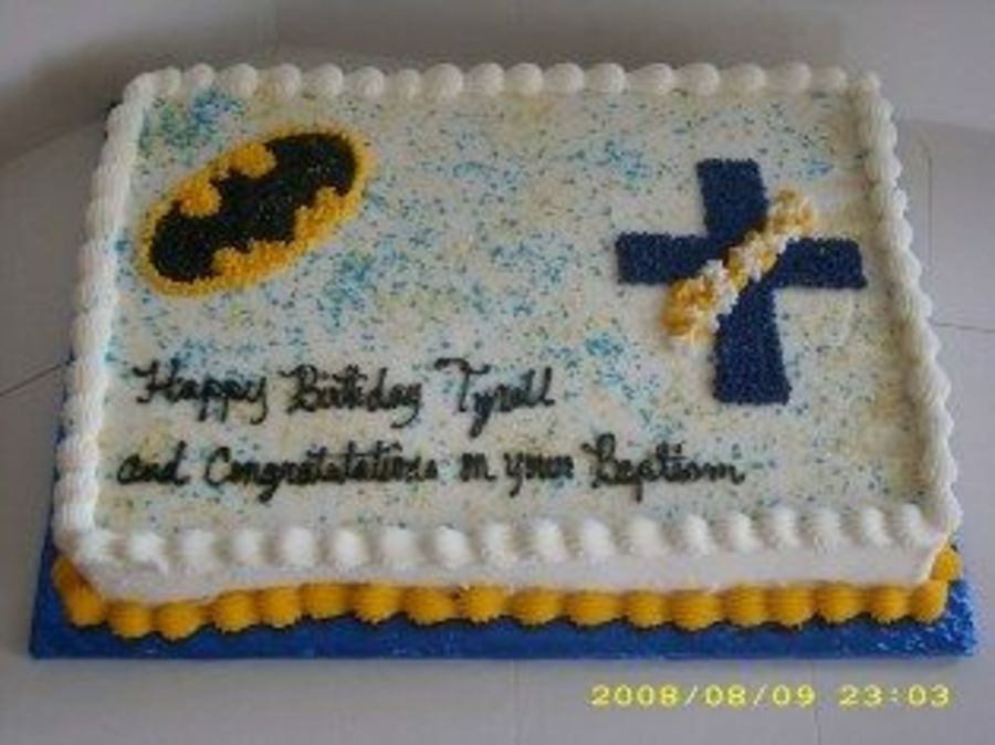9x13 white cake, BC icing. A kid's birthday and baptism at once. Edible glitter. Thanks for looking!