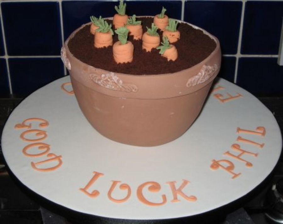 Cake made for friend leaving DH's work. He loves his garden & planting, and so I thought this would be fitting for tea & cake on his last day! Chocolate cake made in pudding bowl, covered in fondant. Cake crumbs for soil, and modelling paste carrots!