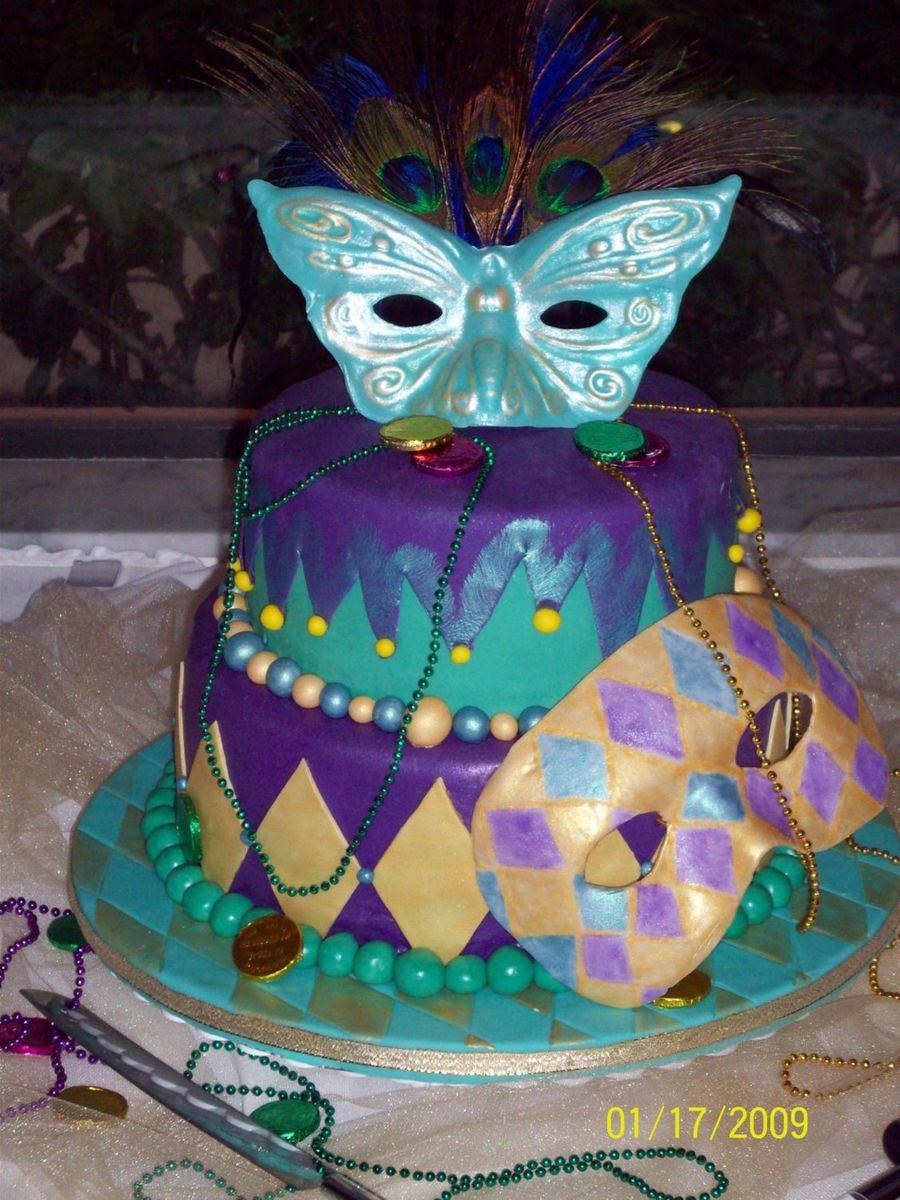 The cake is covered in MMF, the mask are both made with Wilton fondant then painted and Luster dusted. I had a hard time deciding on how I wanted the top layer to look.