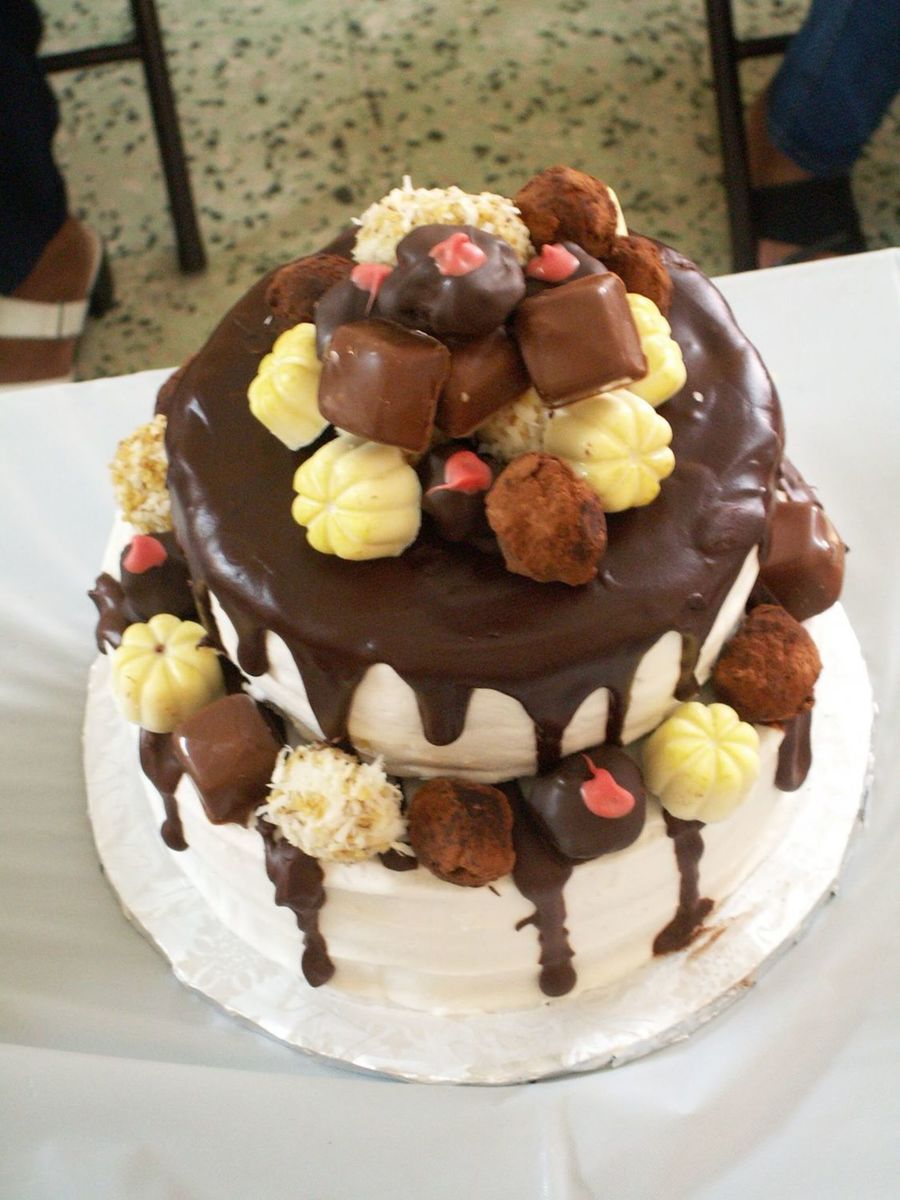 Tow tier of almond flavored cake with fresh strawberry filling, covered in buttercream and chocolate ganache, then decorated with handmade chocolates and truffles