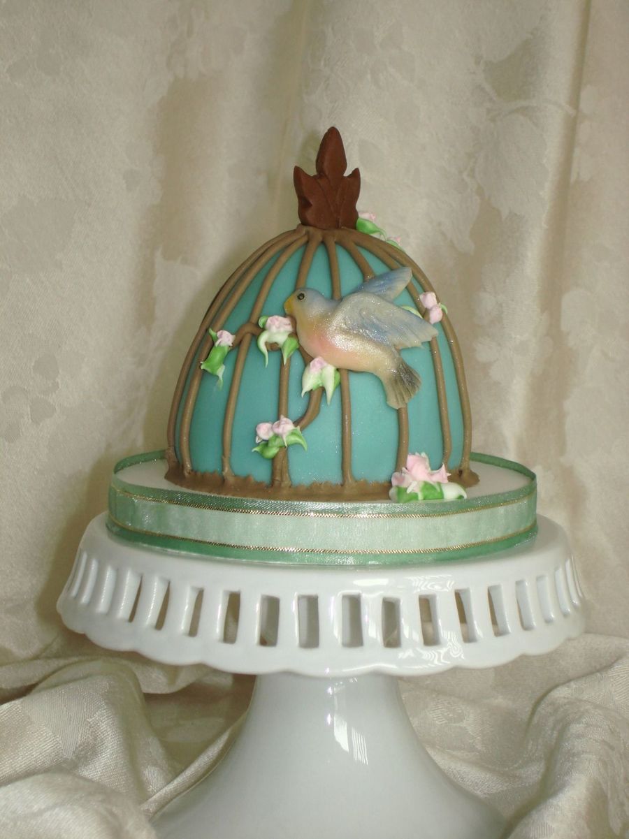 Chocolate cake with choc. BC filling, covered with blue tinted chocolate candy clay. Piped royal icing cage and flowers. Bird is chocolate candy clay dusted with luster dust.