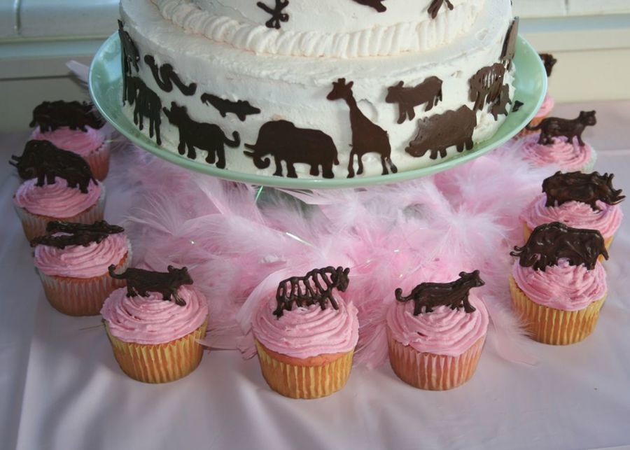 Our daughter loves princesses & animals so we had a Princess of the Jungle party for her 3rd birthday. Everything was inspired off of the dress I bought her. I scanned the dress, redrew the animals and used them for the invites & cake. I printed them and traced/piped chocolate on wax paper. The cupcakes are cherry chip with BC frosting. They match the tiered cake and perfect for all the kiddos!