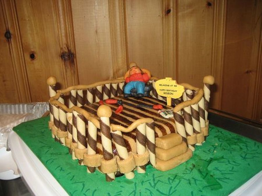 This cake was made for a friends 40th birthday, as he is passionate about building decks, hence he is relaxing at 40! with the tools scattered around him
