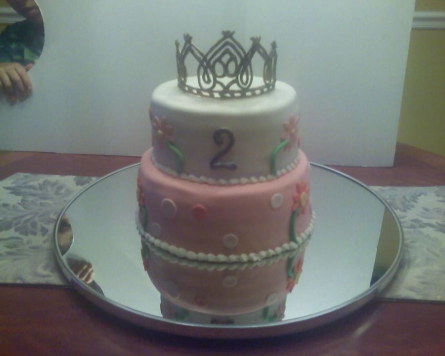 rolled fondant cake designed for a 2 year old with a white choc crown dusted with edible silver.