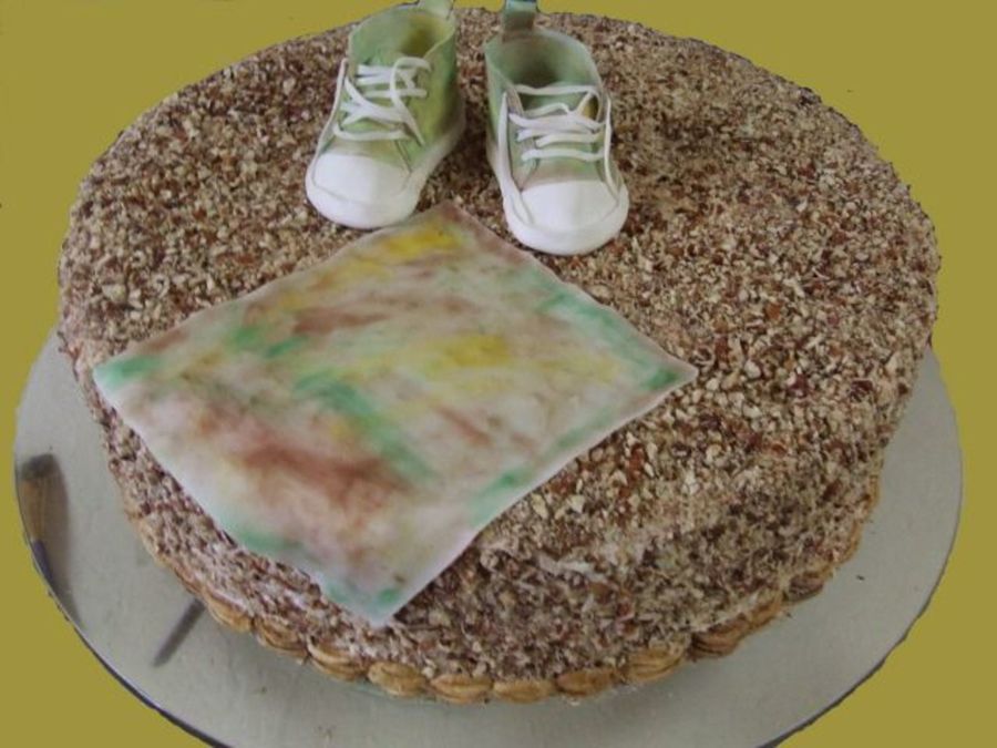 Italian cream cake, with gumpaste baby shoes & blanket. The theme was camo/hunting