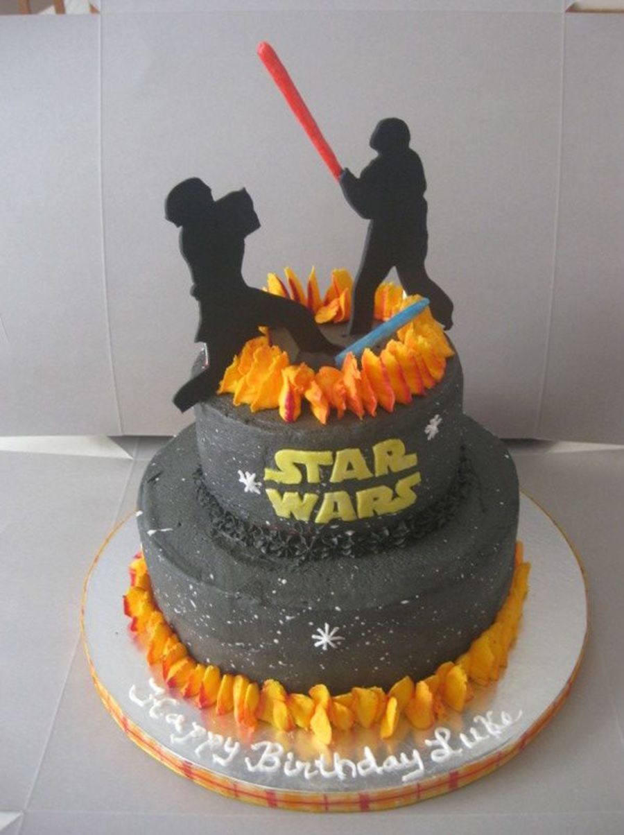 Star Wars cake. The scene on top is where Luke got his hand cut off by Darth Vader. I got many of these ideas from the gallery. Thanks to everyone for their inspiration!